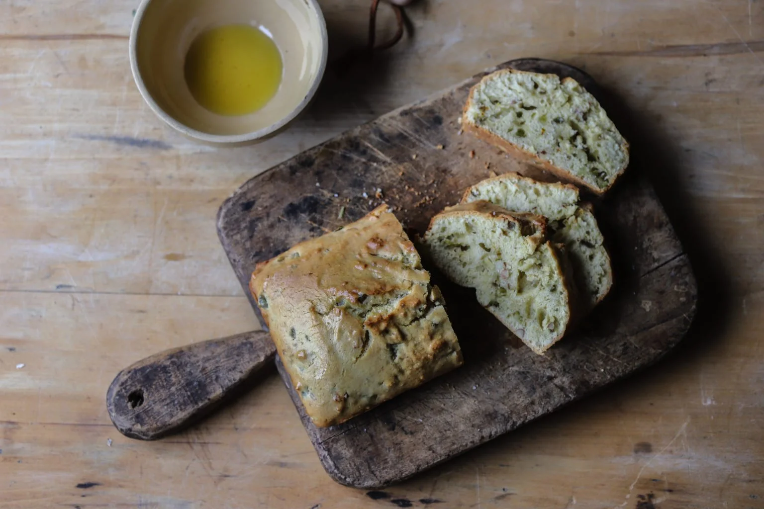 Transfer the batter to the loaf pan and place in the oven. Bake for 45-50 minutes. Remove from the oven and let cool for 10 minutes. Remove the bread from the pan, brush the top with a little olive oil and serve.