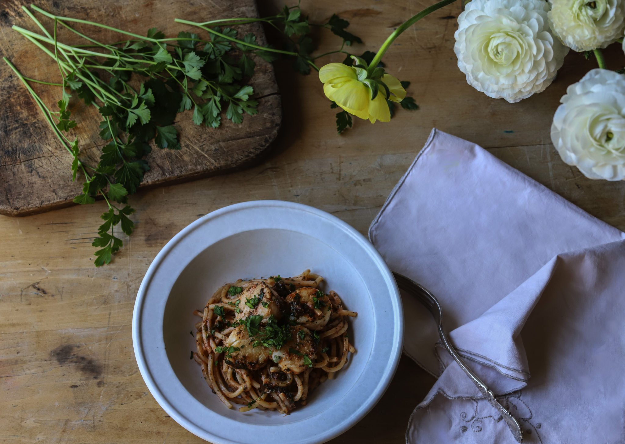 Scallops with Large Leaf Sorrel, Parsley and Spaghetti