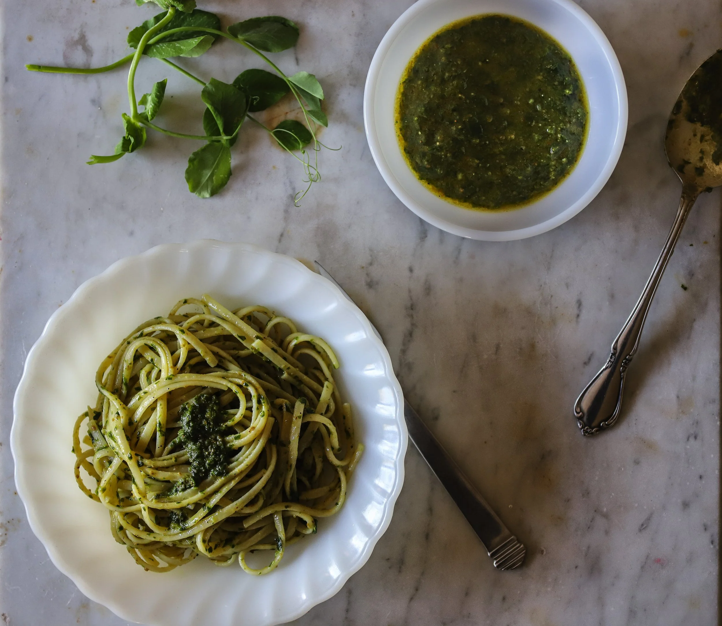 Linguine with Snow Pea Leaves and Green Garlic Pesto